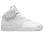 The Louis Vuitton x Nike Air Force 1 Mid “Triple White” is the coveted monochromatic white colourway included in the collaboration by the storied high fashion brand that was directed by the late Virgil Abloh. This version is one of the multiple colourways of the Air Force 1 produced by Louis Vuitton, Nike, and Abloh in 2022. It features a monochromatic white leather upper with Louis Vuitton’s famous monogram print stamped into the material while a stitched Swoosh outline appears on either side of the shoe. Other design elements include a reworked ‘Louis Vuitton Air Force 1’ logo on the side of the tongue and a white tab on the lateral side of the Swoosh on the mid-panel.