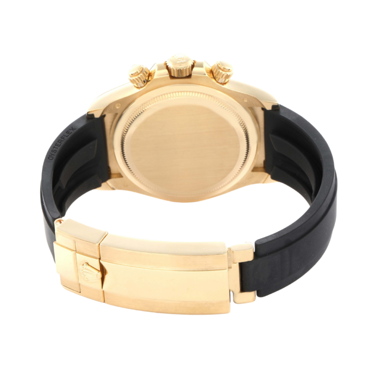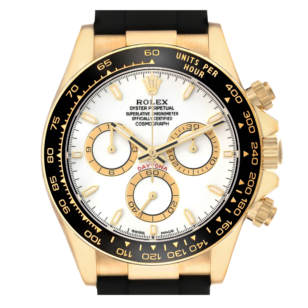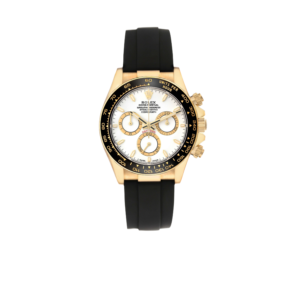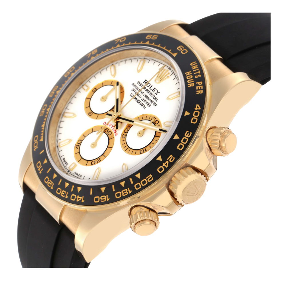 Dial: White dial with yellow gold luminescent baton hands and hour markers. Three yellow gold outlined chronograph subdials — small seconds at 6 o’clock, 30-minutes at 3 o’clock, and 12-hours at 9 o’clock. Bracelet: Black oysterflex strap with an 18K yellow gold flip-lock clasp. Condition: Mint condition.