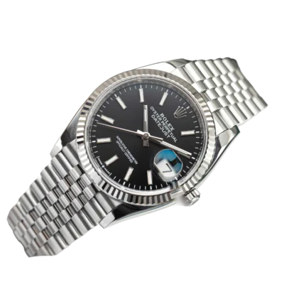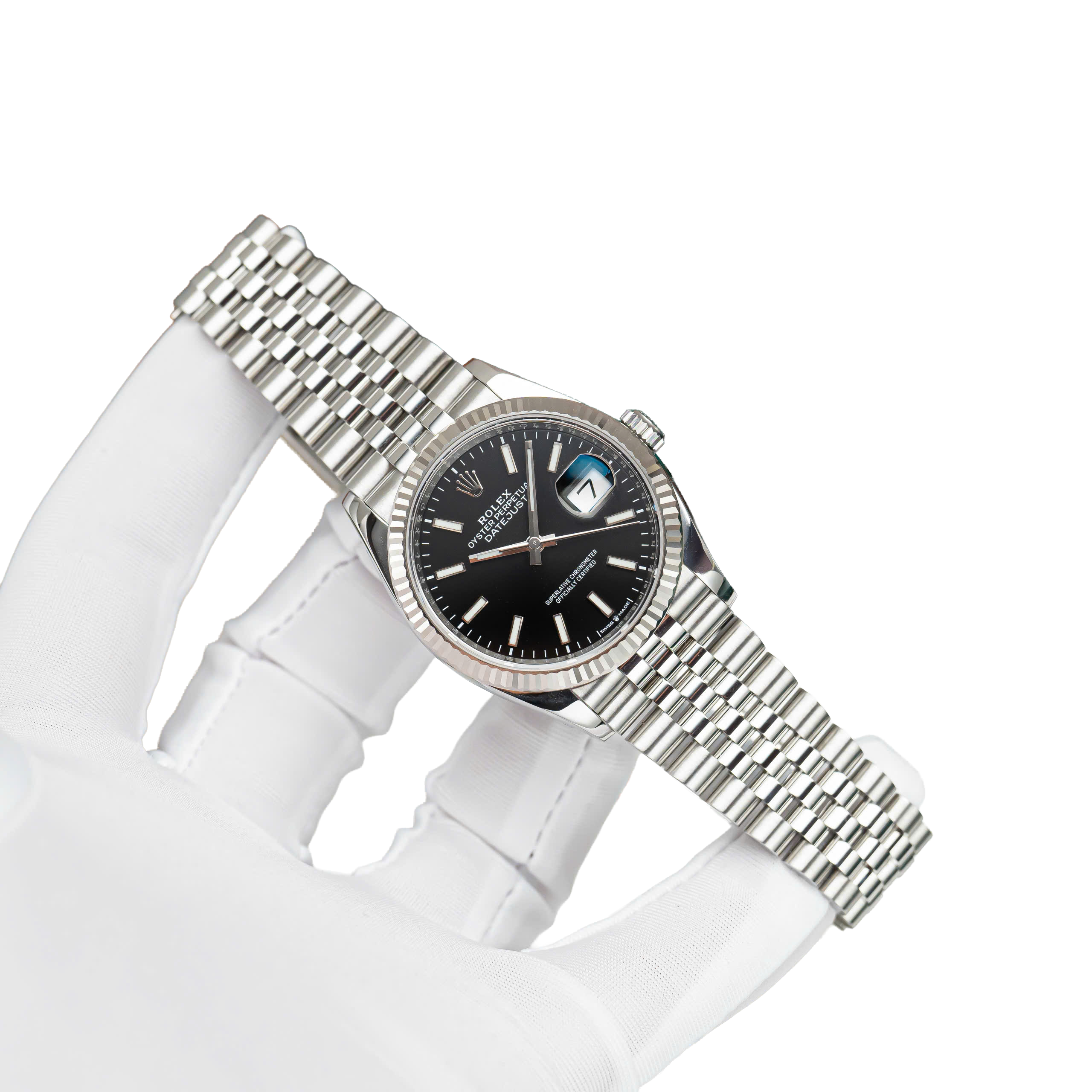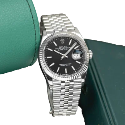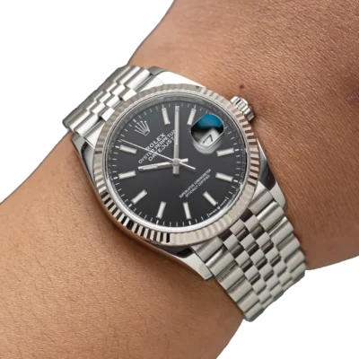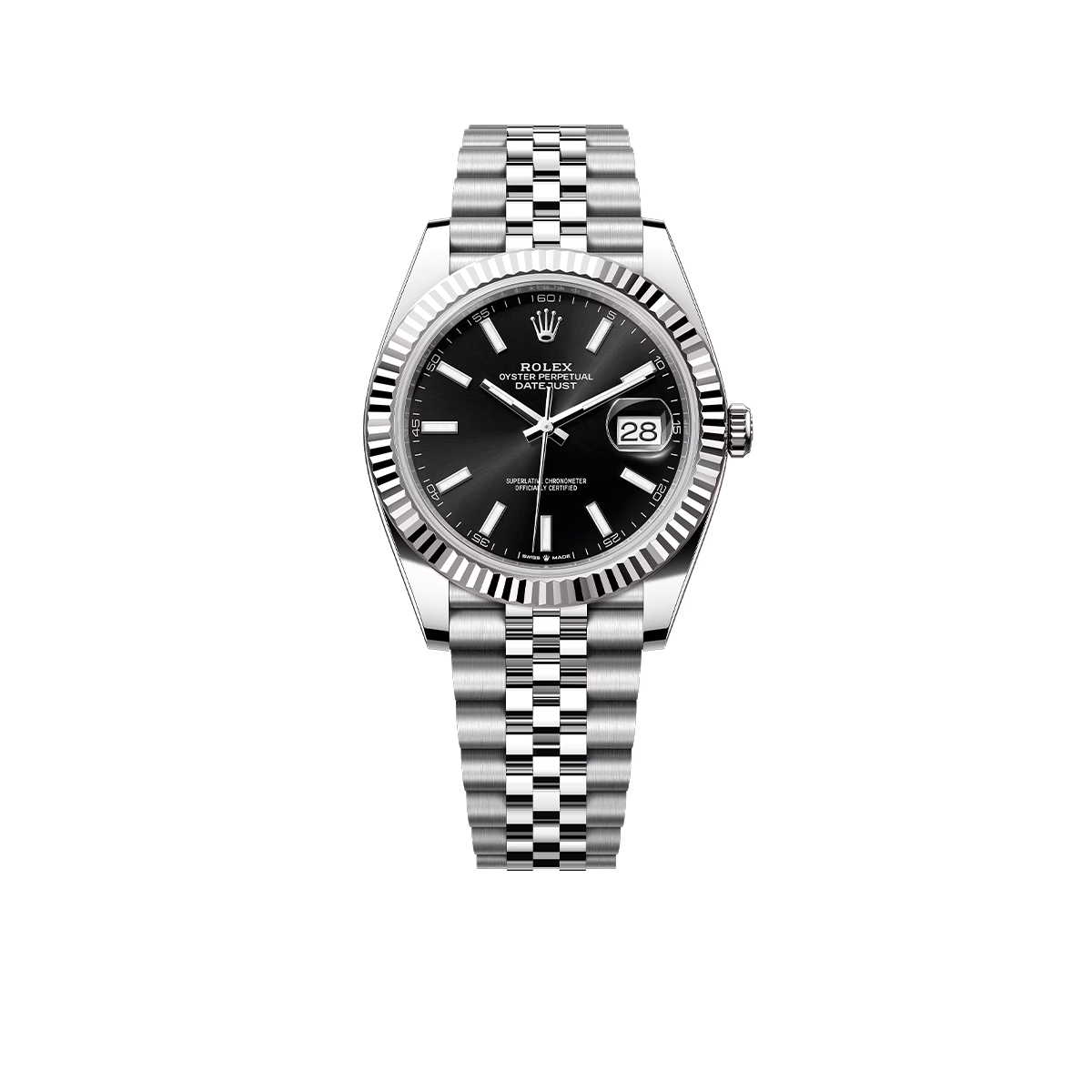 A Rolex Datejust might be the ultimate everyday watch – sharp and stylish, but supremely capable and robust as well! This 41mm modelfeatures a sharp black dial, the coveted fluted bezel / Jubilee bracelet combination, and includes its boxes, manuals, tags and certificate.