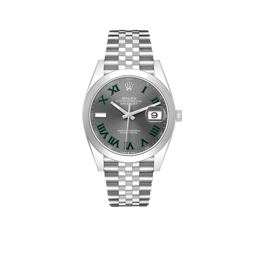 The Rolex Datejust 126300 ‘Wimbledon’ is a distinguished and sporty take on the classic Datejust, crafted in stainless steel with a 41mm polished case. Its slate gray dial, nicknamed “Wimbledon,” features bold green Roman numeral hour markers outlined in black, creating a striking contrast that adds a unique flair to the design. The luminous baton markers and signature date window at 3 o’clock, magnified by the Cyclops lens, ensure practicality and elegance.