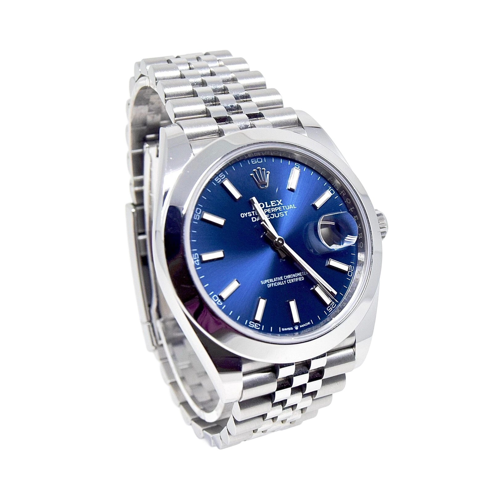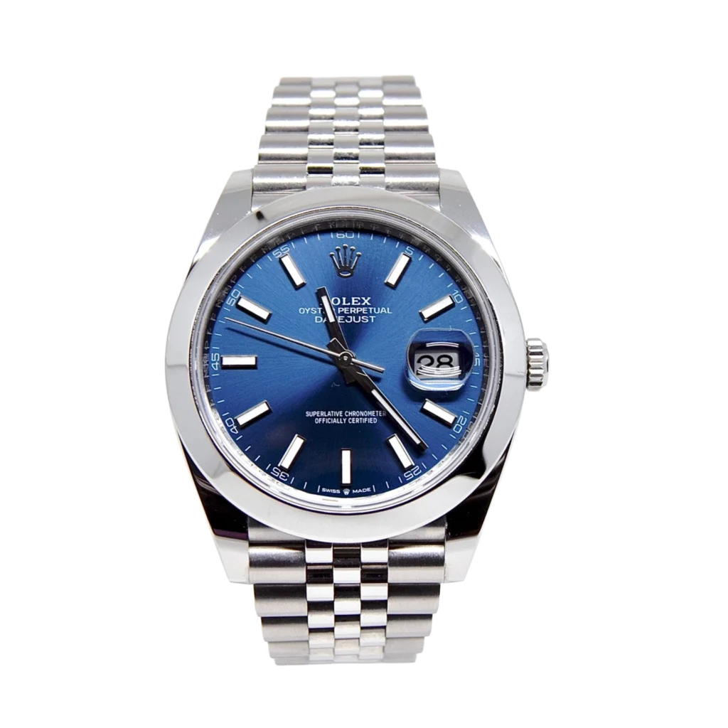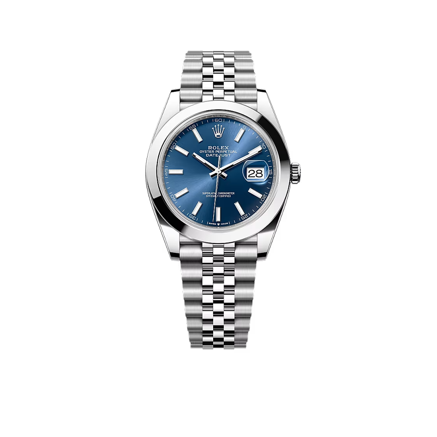 The Rolex Datejust 41 126300 in Oystersteel, featuring a classic blue dial, represents the purest expression of the Datejust lineage—refined, versatile, and resolutely contemporary. Its 41mm Oyster case, paired with a smooth polished bezel, offers a clean, confident silhouette built to withstand time.