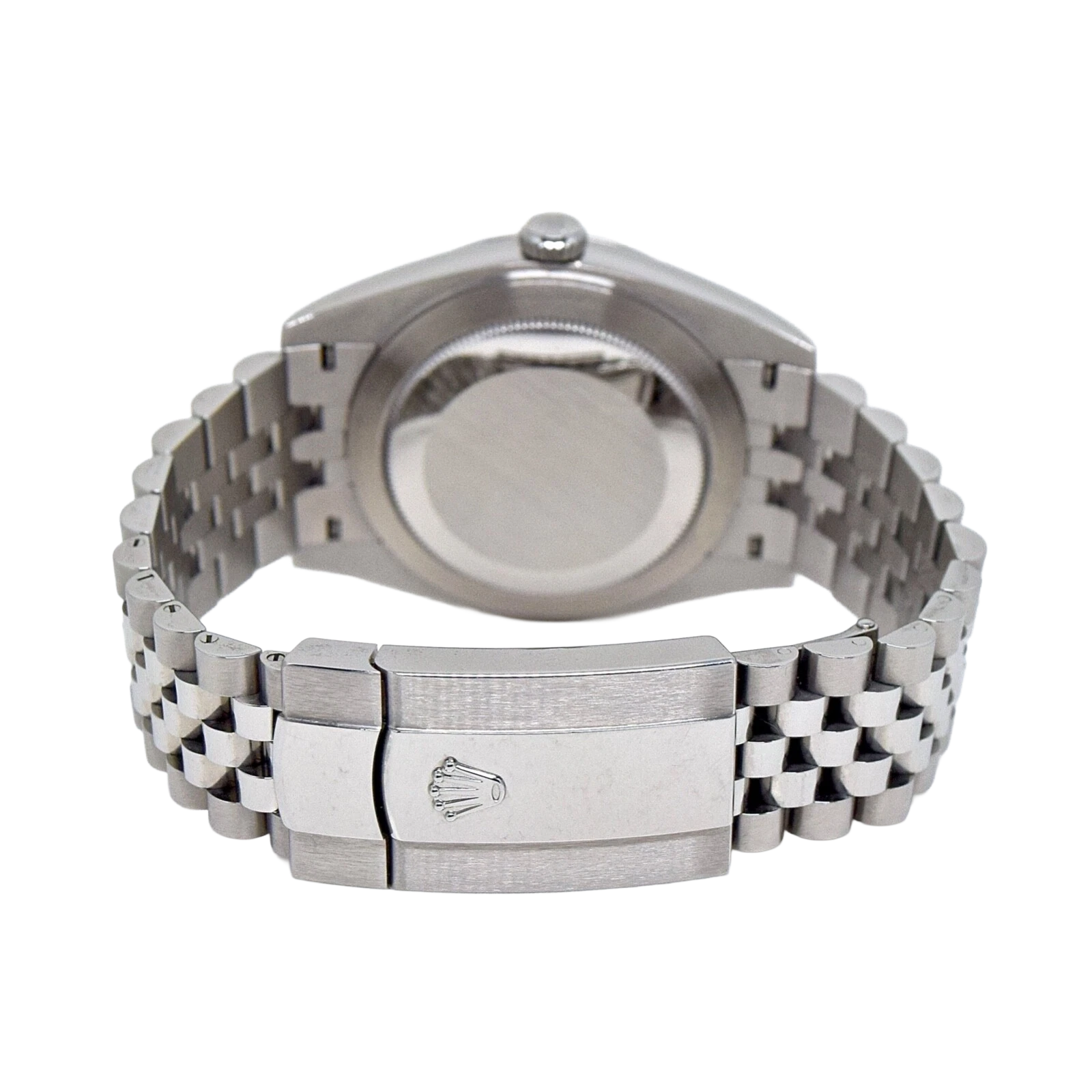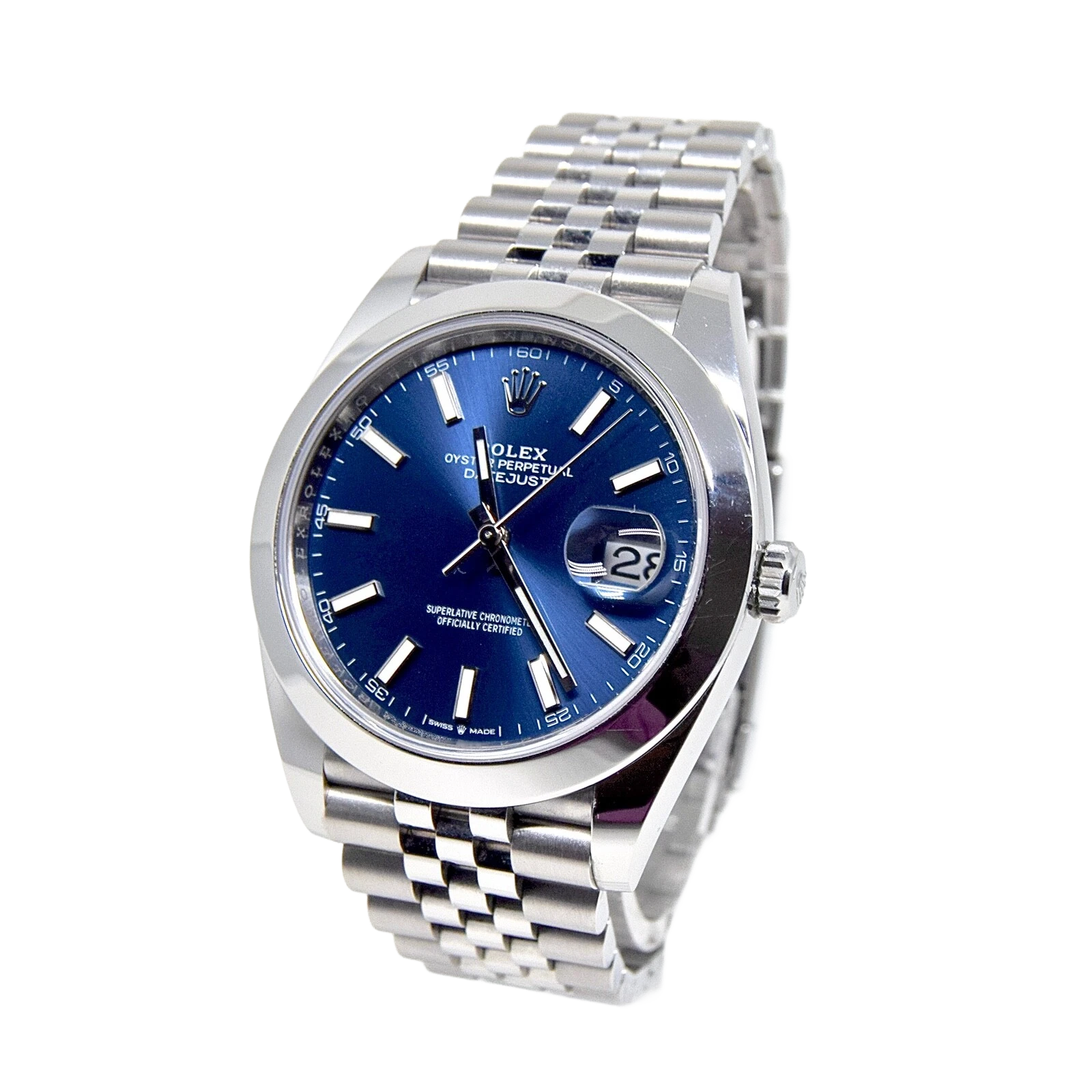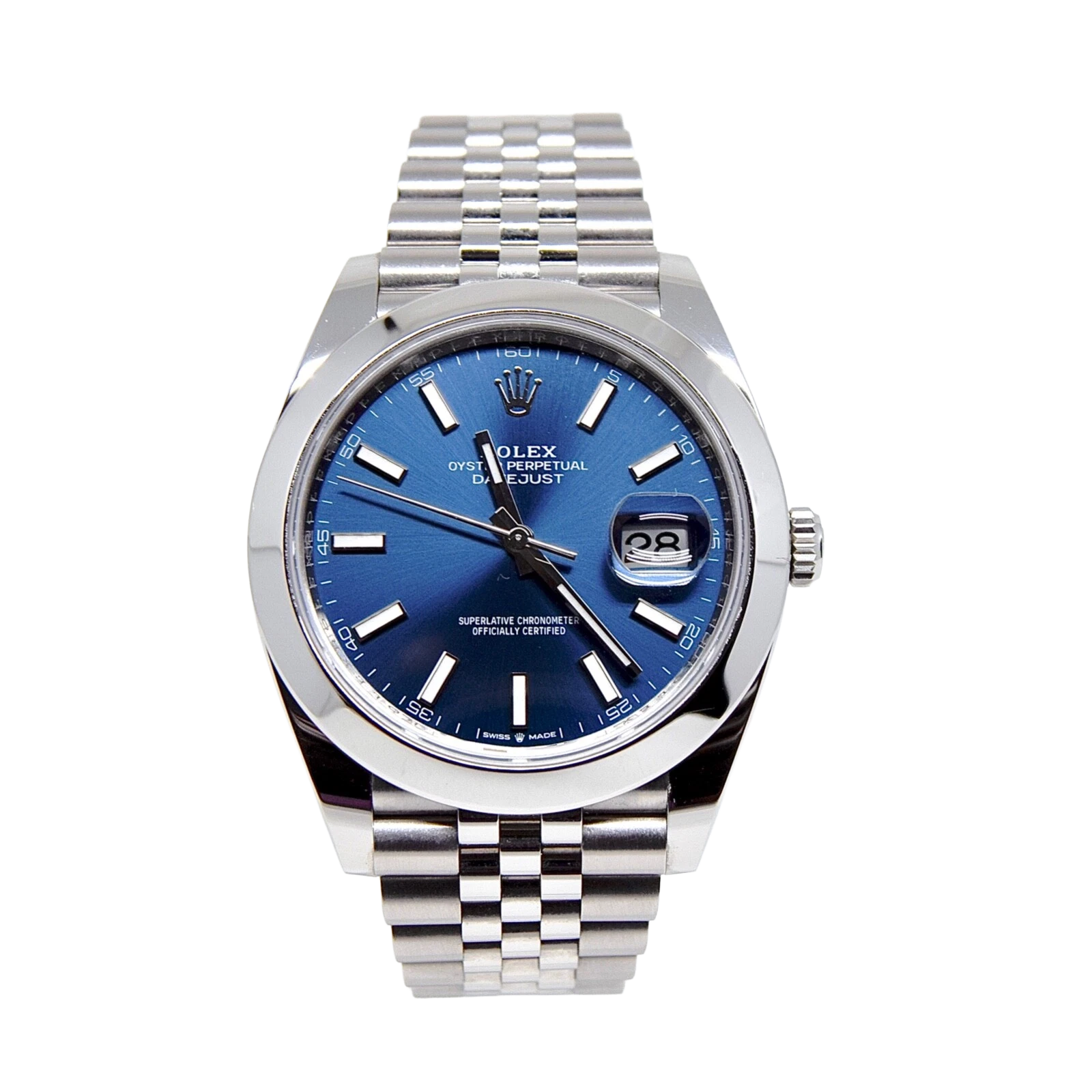 The Rolex Datejust 41 126300 in Oystersteel, featuring a classic blue dial, represents the purest expression of the Datejust lineage—refined, versatile, and resolutely contemporary. Its 41mm Oyster case, paired with a smooth polished bezel, offers a clean, confident silhouette built to withstand time.