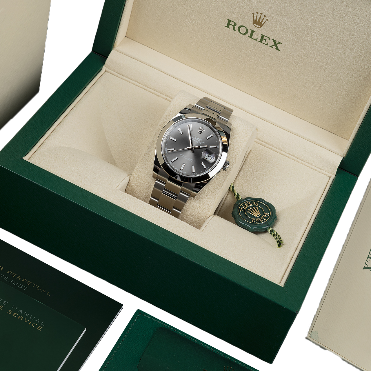 The elegance is in the simplicity of this latest 41mm steel Datejust ref 126300, with smooth bezel and attractive slate grey dial. Powered by Rolex’s self-winding calibre 3235 with 70hr power-reserve, waterproof to 100m.