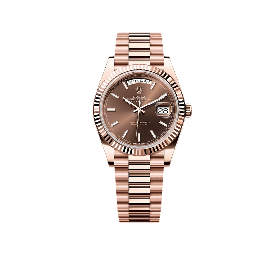 The rich chocolate dial enhances the watch’s sophisticated character, complemented by diamond-style hour markers and rose gold-tone hands that create a balanced, premium aesthetic. Classic Day-Date elements include the weekday display at 12 o’clock and the date window at 3 o’clock, preserving the model’s iconic identity.