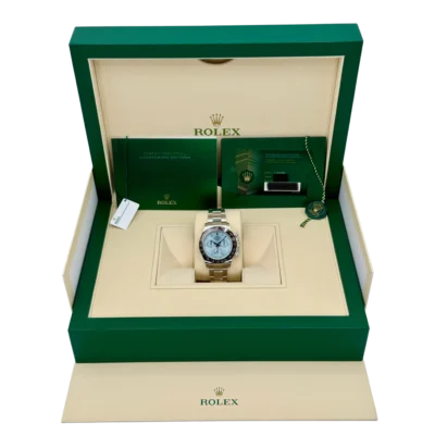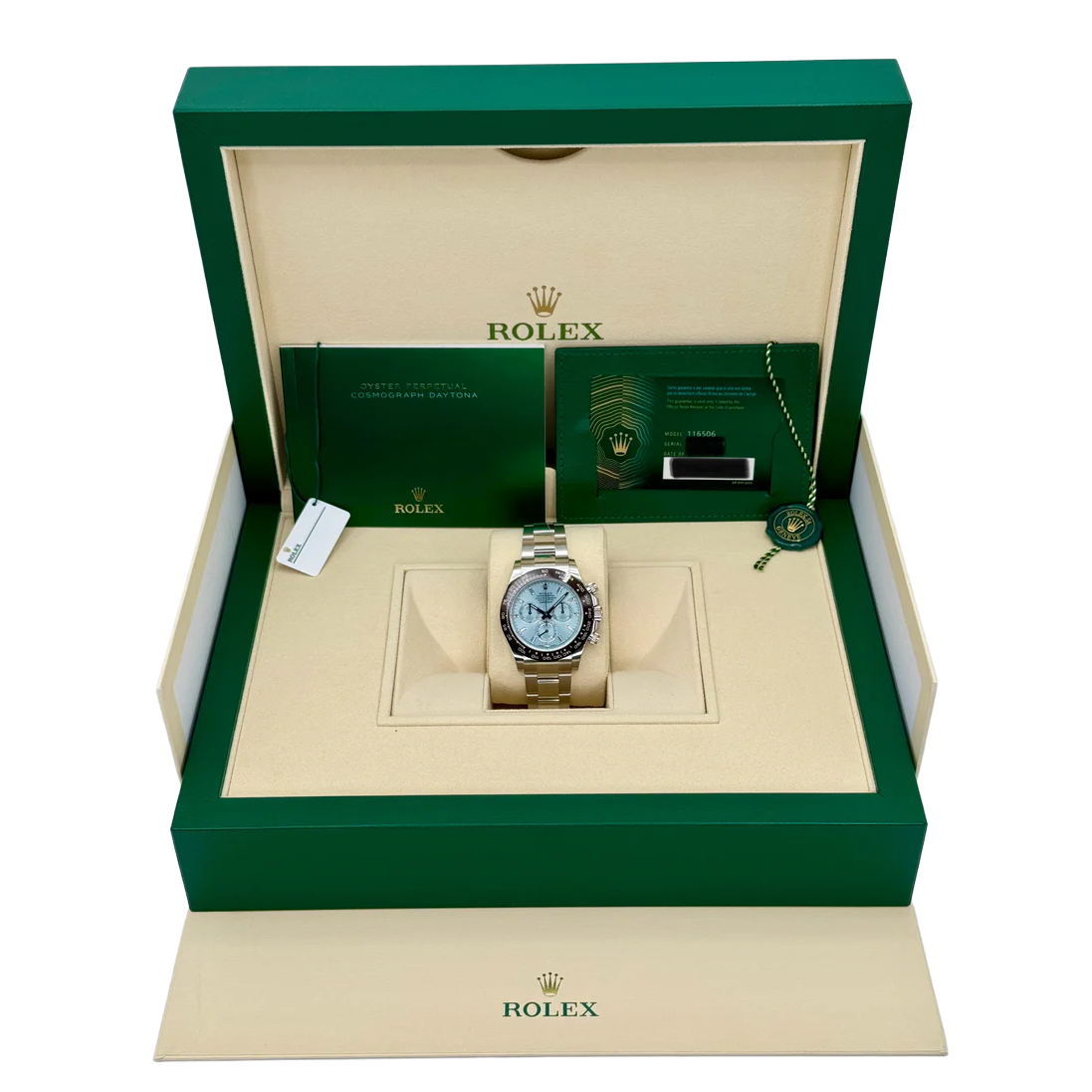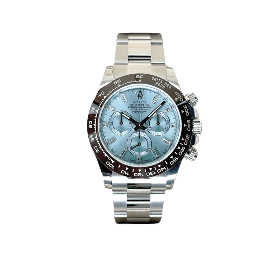 The Rolex Cosmograph Daytona 116506 presents the pinnacle of luxury-inspired design with its 40mm case finished in polished platinum-tone and the distinctive ice blue-style dial that gives the watch a refined, unmistakable identity. Baguette-style diamond hour markers enhance its high-end visual appeal while maintaining a clean and elegant layout.