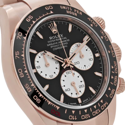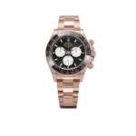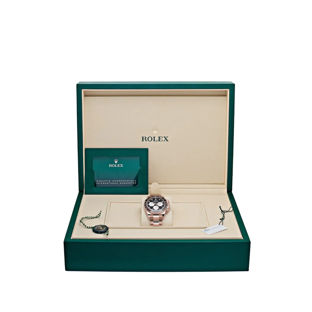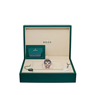 The Rolex Daytona 126525LN ‘Le Mans’ is a tribute to motorsport history, embodying elegance and performance in equal measure. Crafted from 18k rose gold, the 40mm case exudes luxury while retaining the Daytona’s iconic sport-inspired design. The black dial is strikingly detailed with gold accents and features an eye-catching red 100 marker on the tachymeter scale—a nod to the 100th anniversary of the 24 Hours of Le Mans.
