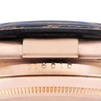 Case: 18k rose gold oyster case 40.0 mm in diameter. Special screw-down push buttons. Chronograph pushers and pointed crown guards. Rolex logo on the crown.