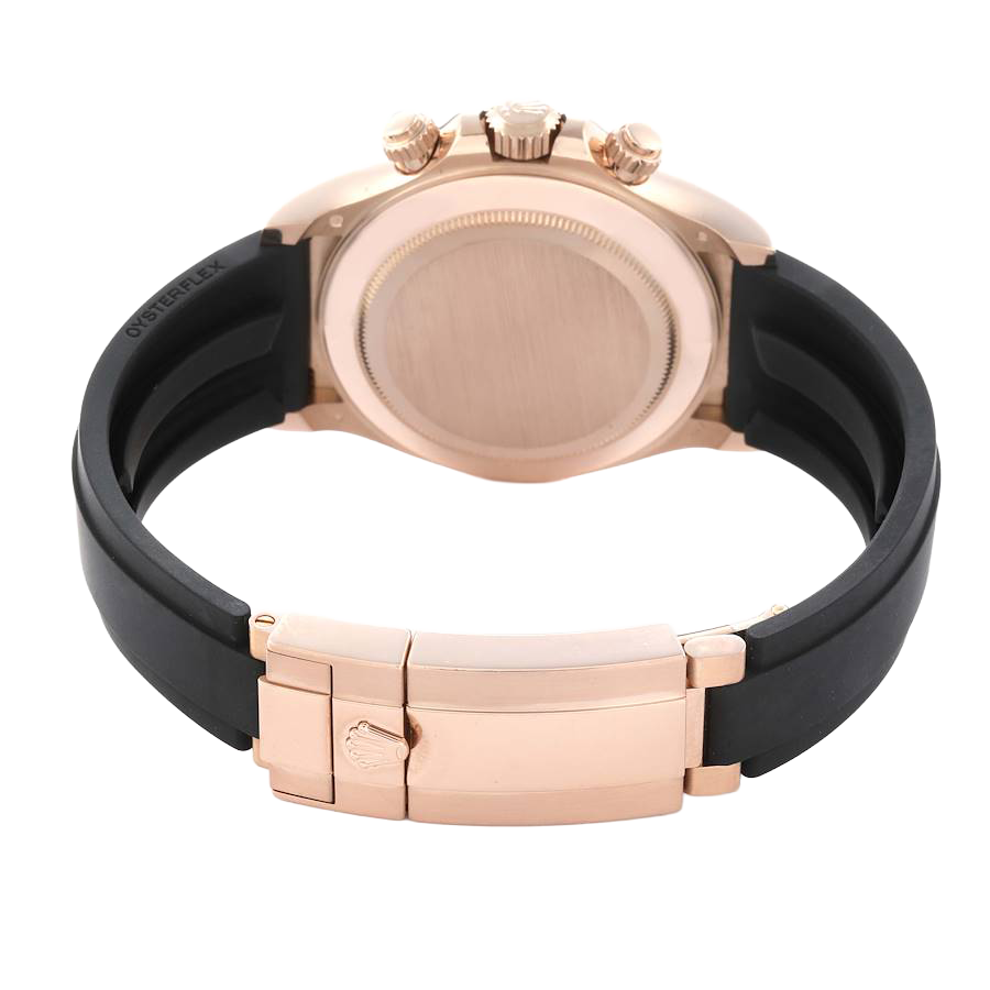 Bracelet: Black Oysterflex rubber strap with an 18K rose gold flip-lock clasp and a Rolex Glidelock extension system.