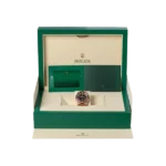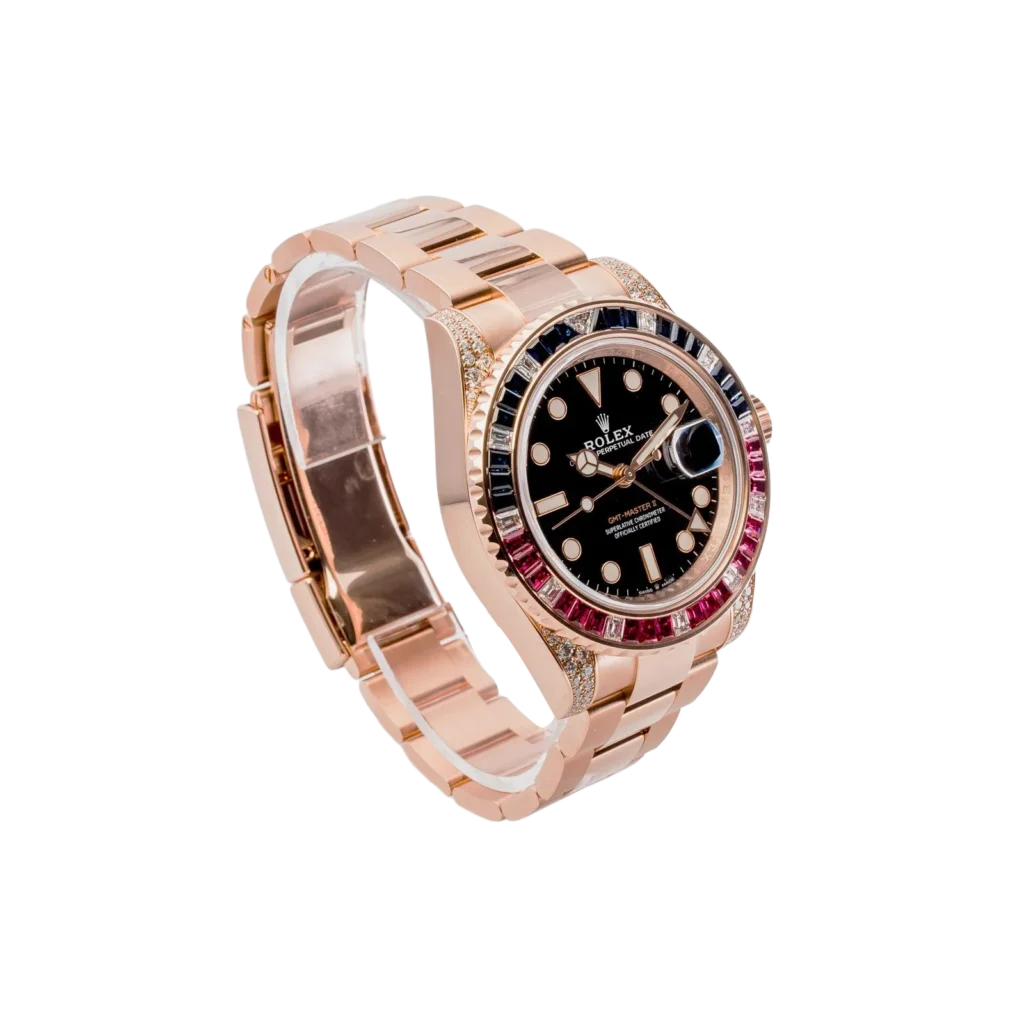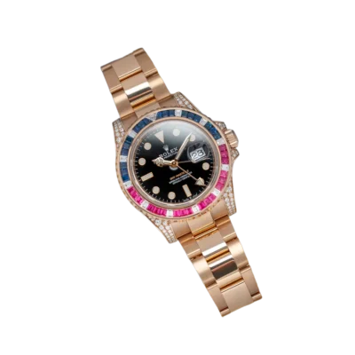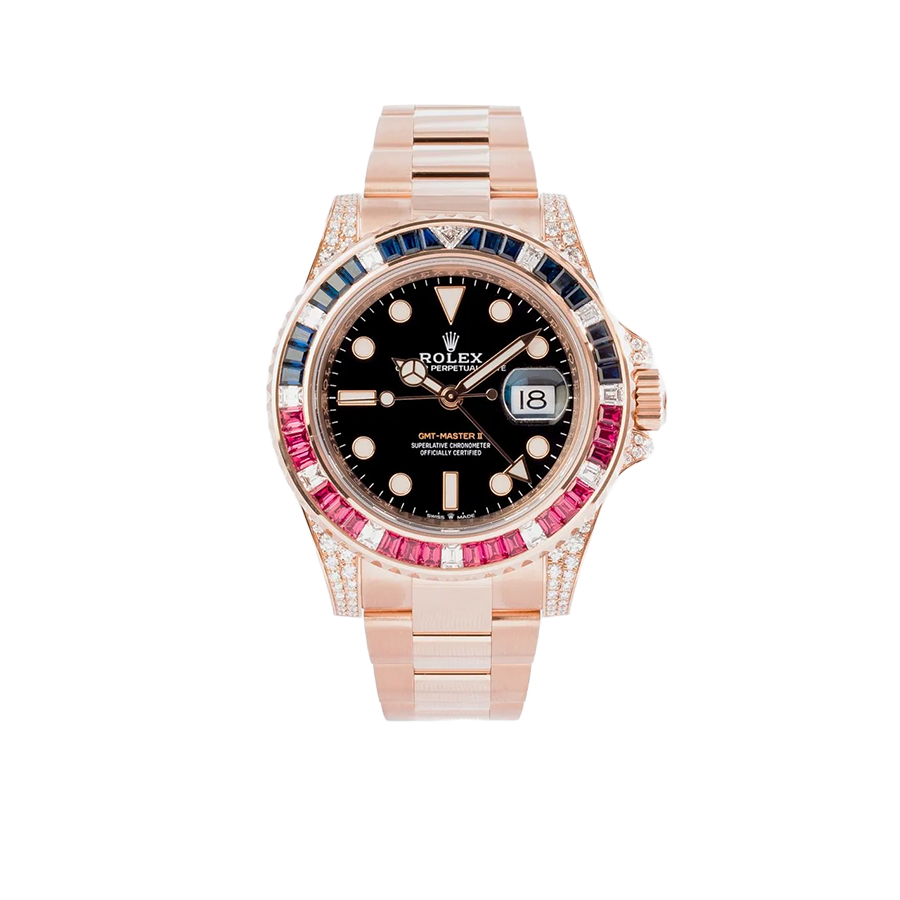 Travel in style with the Rolex GMT-Master II 126755SARU. A 40mm rose gold case, set with diamonds, pairs with a matching Oyster bracelet for an opulent feel. The black dial features luminous rose gold hour markers, while the bezel steals the spotlight with square-cut rubies, sapphires and diamonds. Powered by the caliber 3285 automatic movement with a 70-hour power reserve, this sport watch keeps your look elevated for every moment.