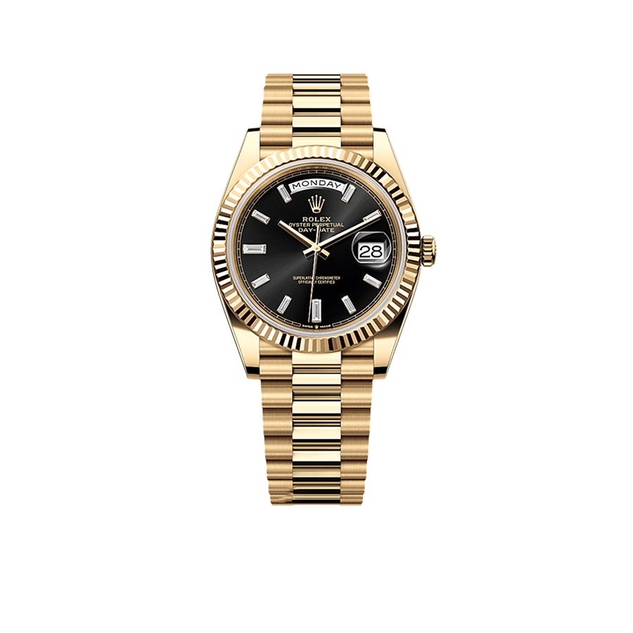 Case: 18k yellow gold oyster case 40.0 mm in diameter. Rolex logo on the crown.