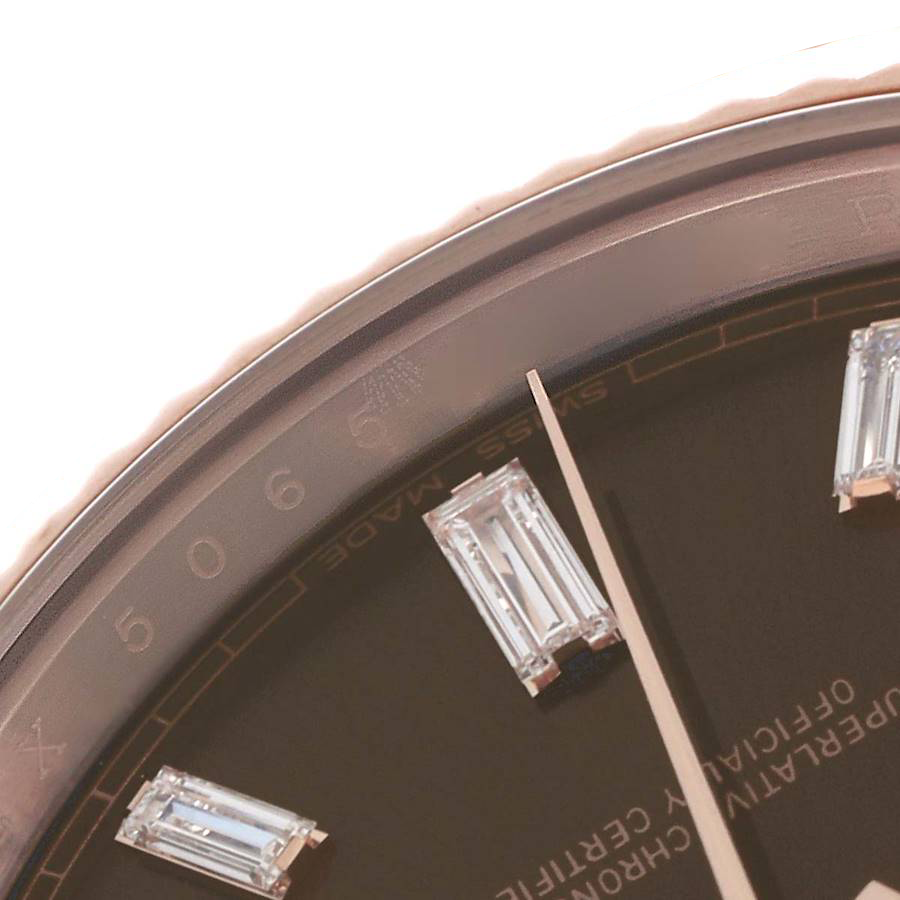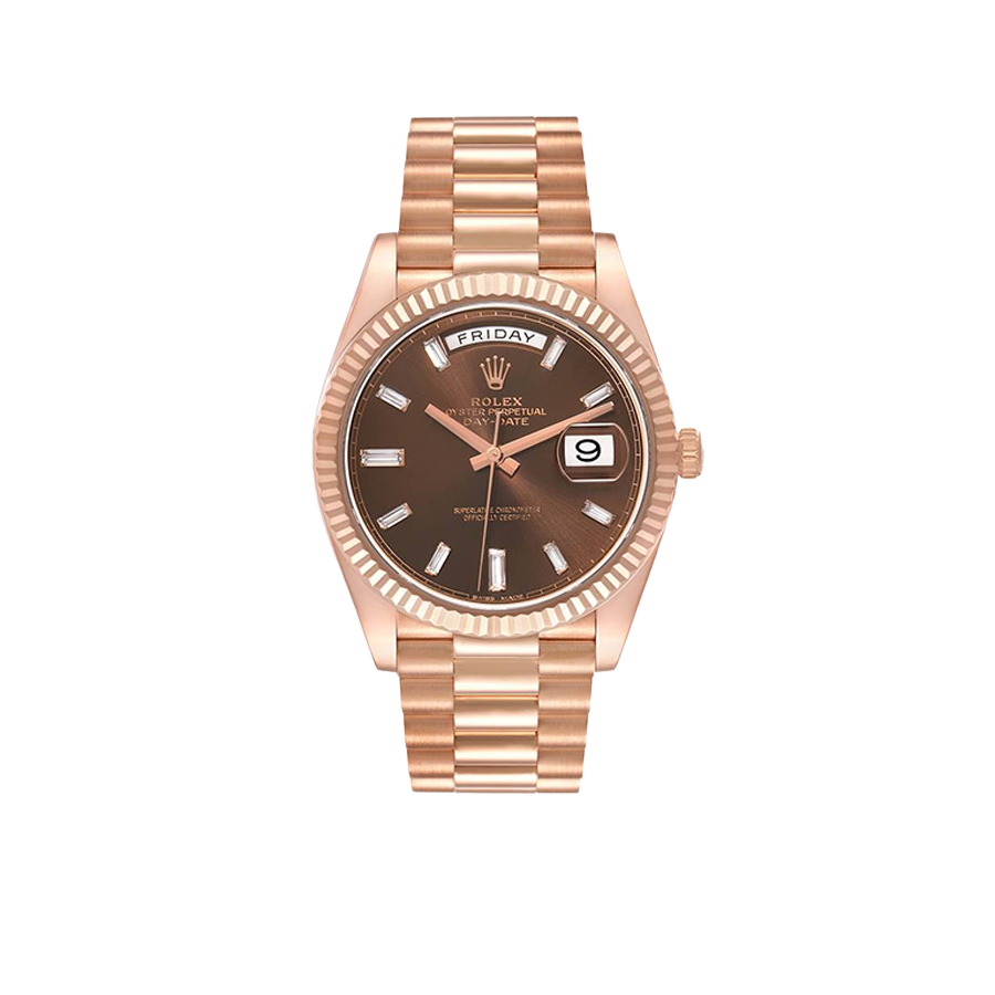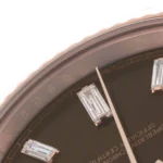 The rich chocolate dial enhances the watch’s sophisticated character, complemented by diamond-style hour markers and rose gold-tone hands that create a balanced, premium aesthetic. Classic Day-Date elements include the weekday display at 12 o’clock and the date window at 3 o’clock, preserving the model’s iconic identity.