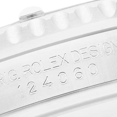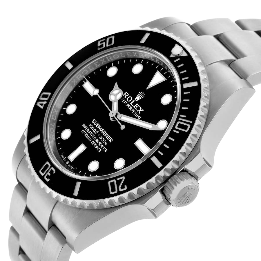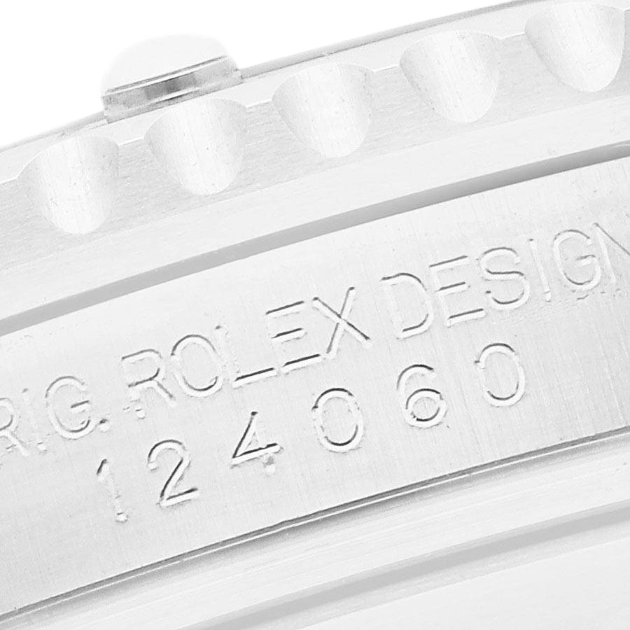 Rolex Submariner Non-Date Ceramic Bezel Steel Mens Watch 124060. Officially certified chronometer automatic self-winding movement. Stainless steel oyster case 41.0 mm in diameter. Rolex logo on the crown. Pointed crown guards. Special time-lapse unidirectional rotating Cerachrom ceramic black bezel engraved with 0-60 graduation. Scratch resistant sapphire crystal. Black dial with white luminescent inlay Mercedes hands and dot hour markers. Luminescent lollipop-tipped seconds hand. Outer stick minute markers. Stainless steel oyster bracelet with a flip-lock clasp